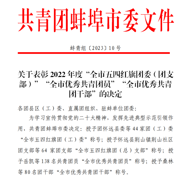近日,共青團蚌埠市委發(fā)布《關于表彰2022年度“全市五四紅旗團委(團支部) ”“全市優(yōu)秀共青團員”“全市優(yōu)秀共青團干部”的決定》,授予市城投公司團支部2022年度“全市五四紅旗團支部”稱號,城投公司原團工委書記、工程部部長蔣文超同志2022年度“全市優(yōu)秀共青團干部”稱號,城投智慧停車公司員工張錦秋同志2022年度“全市優(yōu)秀共青團員”稱號。